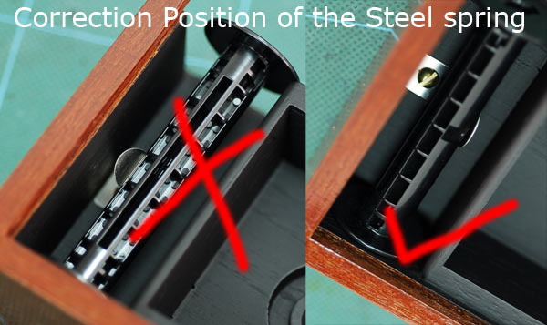 When loading the film, some customers may put the film spool into the film chamber with the steel spring in a wrong position, and this results in the steel spring cannot hold the film firmly and prevent it from cruling. For proper position, please see the above photos.