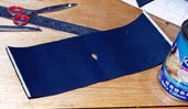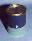 | 1. We use fancy paper for this example. Cut a piece of blue fancy paper which is the same height as the tin and about 1-2cmm longer than the diameter of the tin. Then add double-sided adhesive tape to both edges of the fancy paper. |
