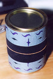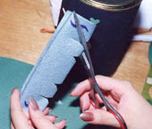 | You can decorate your tin with colored paper. Here we show you how we like to draw on the paper, and how we cut the graphic patterns. You may choose any design for your special one-of-a-kind camera. |